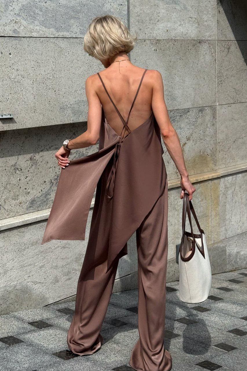 Silk Two Piece Set for Women – Satin Lounge Co-ord with Wide Leg Pants and Tie Back Top – Elegant Summer Outfit in Cream, Black, or Brown